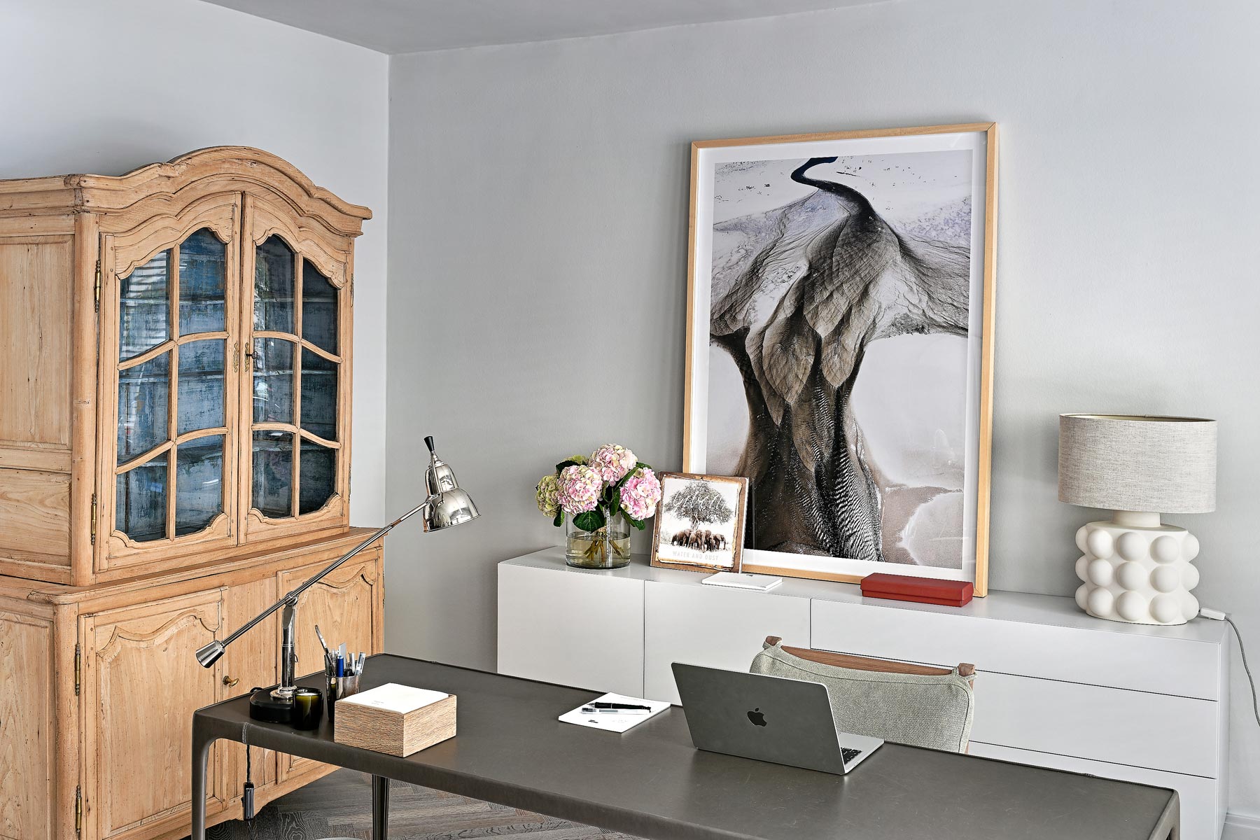 Grün gemusterte Zementfliesen in Küche und Gäste-WC, ein Esstisch mit Lederplatte und der von Marcel Breuer für Thonet entworfene Freischwinger mit Wiener Geflecht, machen den Materialmix perfekt.