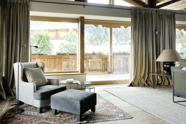 Rustikales Altholz trifft auf Schwarzstahl; das Zusammenspiel der Beiden schafft eine heimelige, gemütliche, aber gleichzeitig moderne und klare Atmosphäre. Der rustikale Charakter wird durch Materialien wie Loden und Hirschleder unterstrichen, eine Steinwanne und die Badbeläge aus hellem Naturstein beziehen die umgebenden Berge mit ein. Handbemalte Fliesen einer italienischen Manufaktur in den Bädern sorgen für eine Portion Extravaganz.